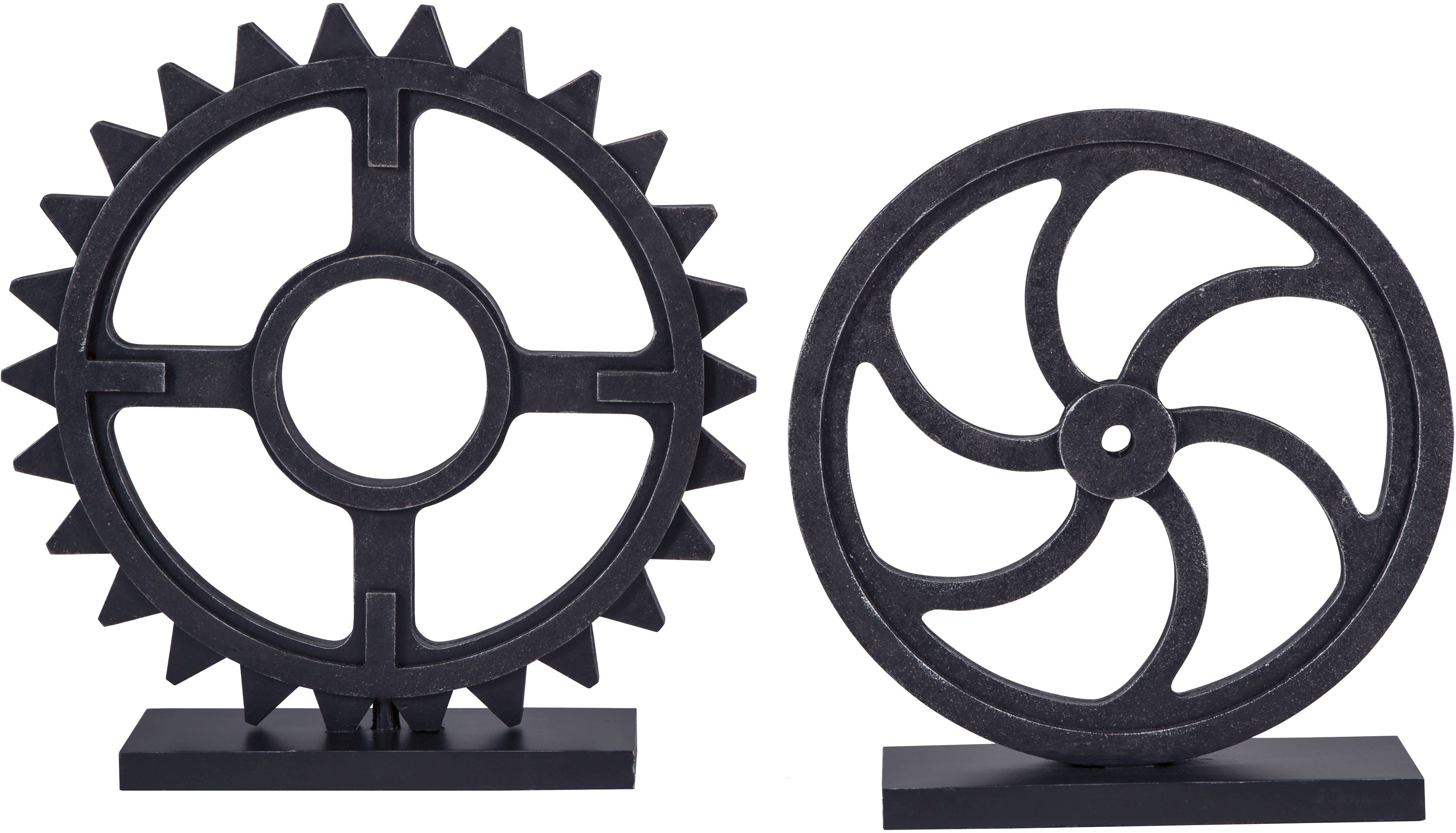 The Dermot sculpture set comes with 2 pieces carved into the shape of gears. Sculptures are made from wood with a chic, antique-black finish.