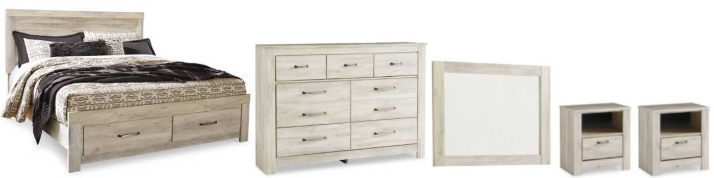Includes storage bed (headboard, footboard with 2 storage drawers, rails and slats), 7-drawer dresser with mirror and two 1-drawer nightstands