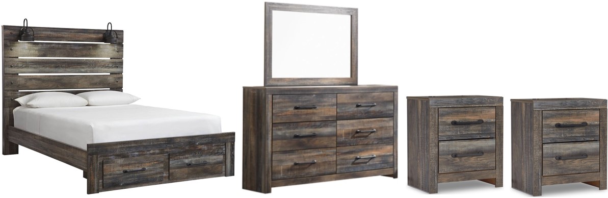 Includes queen-size panel bed (headboard, 2-drawer storage footboard and rails), 6-drawer dresser with mirror and two 2-drawer nightstands